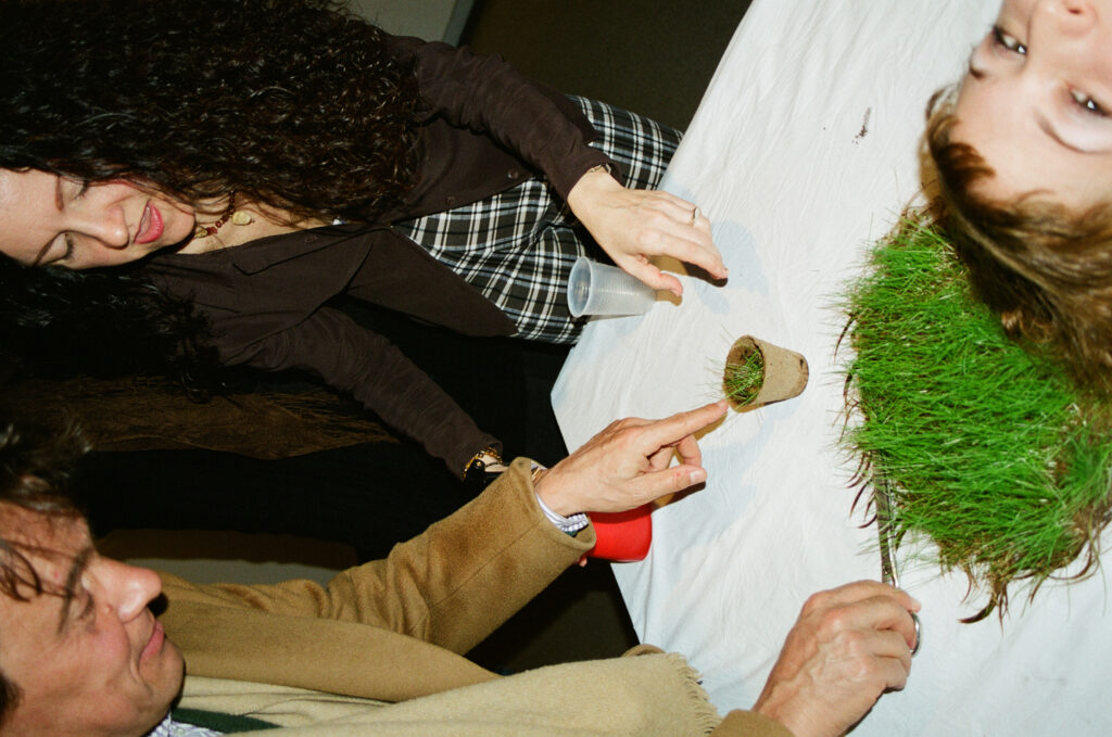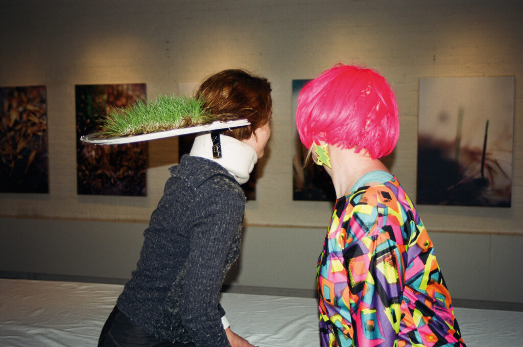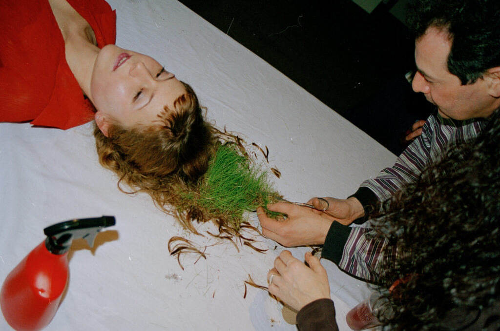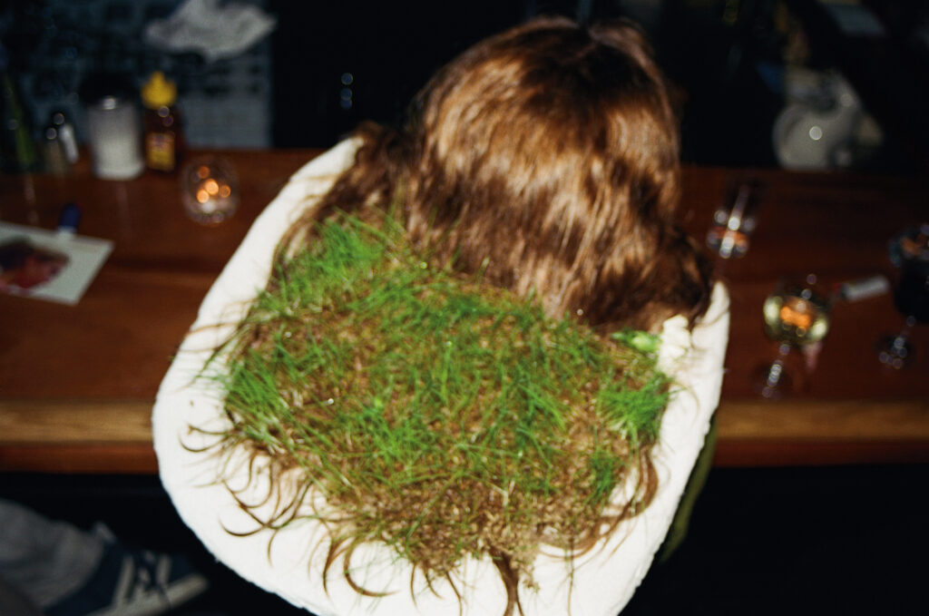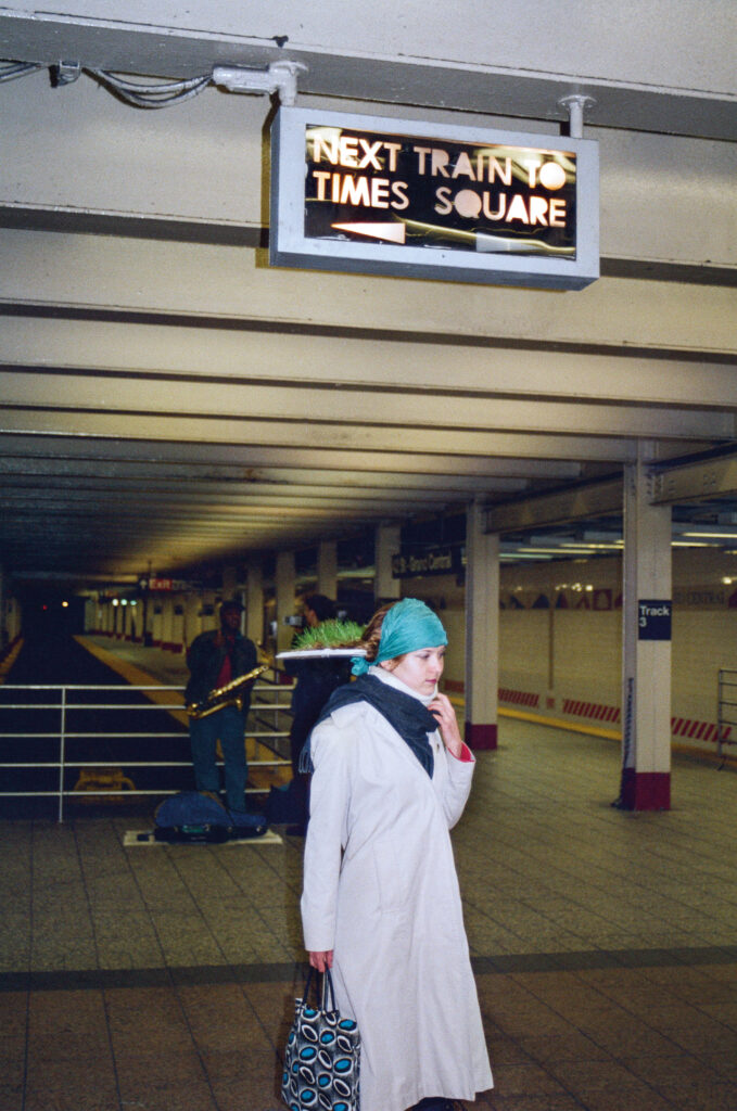 8 Tage lang wuchs Gras in meinem Haar. Bei der Eröffnung meiner Ausstellung SYMBIOTIC in der Vorpal Gallery Soho besähten die Besucher*innen mein Haar mit Grassamen, um das gewachsene Grashaar eine Woche später zu ernten, indem sie es abschnitten und teilweise in kleinen Töpfen mitnahmen. So konnte es noch einige Zeit, verstreut in der City, weiterwachsen. Innerhalb der Performancewoche war ich viel im öffentlichen Raum von NYC unterwegs mit dementsprechend unterschiedlichen Reaktionen auf das Grashaar. Im Folgenden gab es einen Internet-Tagebucheintrag von Elissa Nelson: