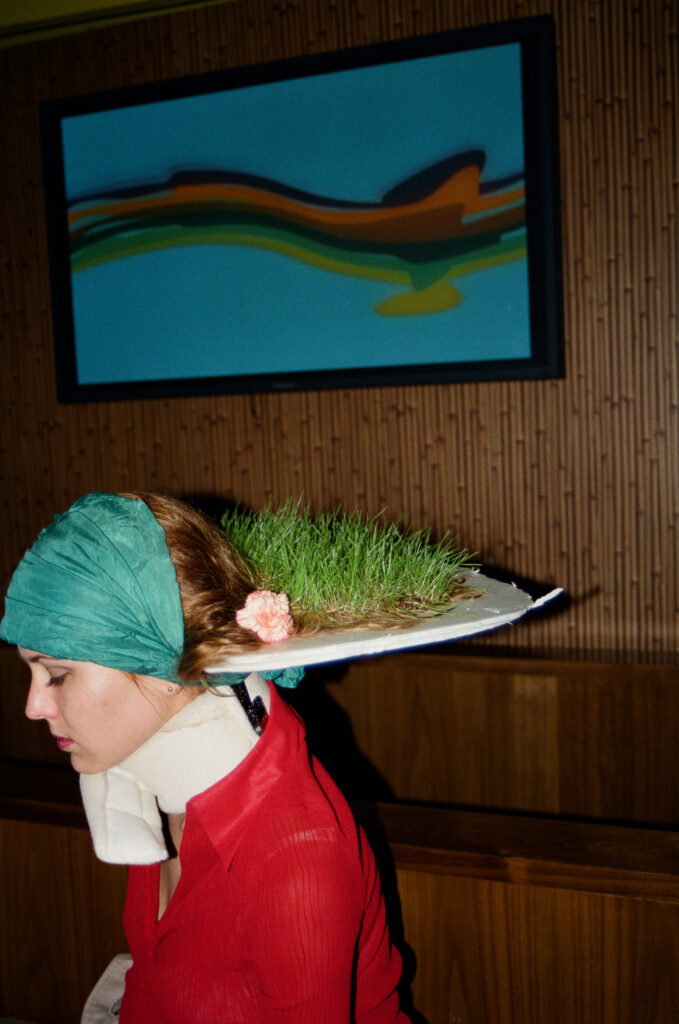 Walking down Houston, I come up behind two girls. They are about my age, mid-twenties, and well-coiffed, carefully put together, in a SoHo sort of way: one girl has dark curly hair, and wears an expensive-looking jacket. The other girl, a blonde, has nice brown boots and a sleek khaki coat. As I walk past them, I notice that the blonde has an extraordinary headpiece on. It isn’t quite a hat; it transcends “hat.” There is a sort of platform extending from the back of her head, above the hairline, but well below the crown of her head. The platform is like the brim of a hat, but bigger: about eight inches wide, and extending back at least six inches. On the platform is a small expanse of growing grass, with a pink carnation placed in the center. The girl’s long blond hair is woven into the whole project, so that the grass is growing out of the dirt on the platform but also out of her hair. I can’t tell how the whole thing is attached to her head; perhaps the platform is supported by a piece underneath it, that goes along her neck and then down underneath the coat.